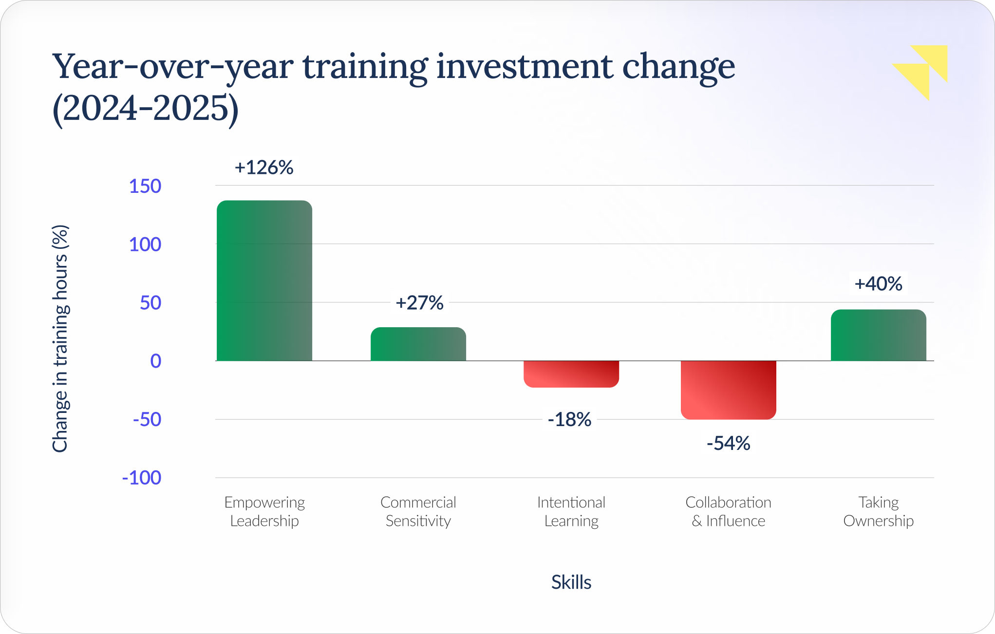 - Empowering leadership grew 126% year-over-year and now represents over half of all training investment, driven by structural shifts in how organizations operate